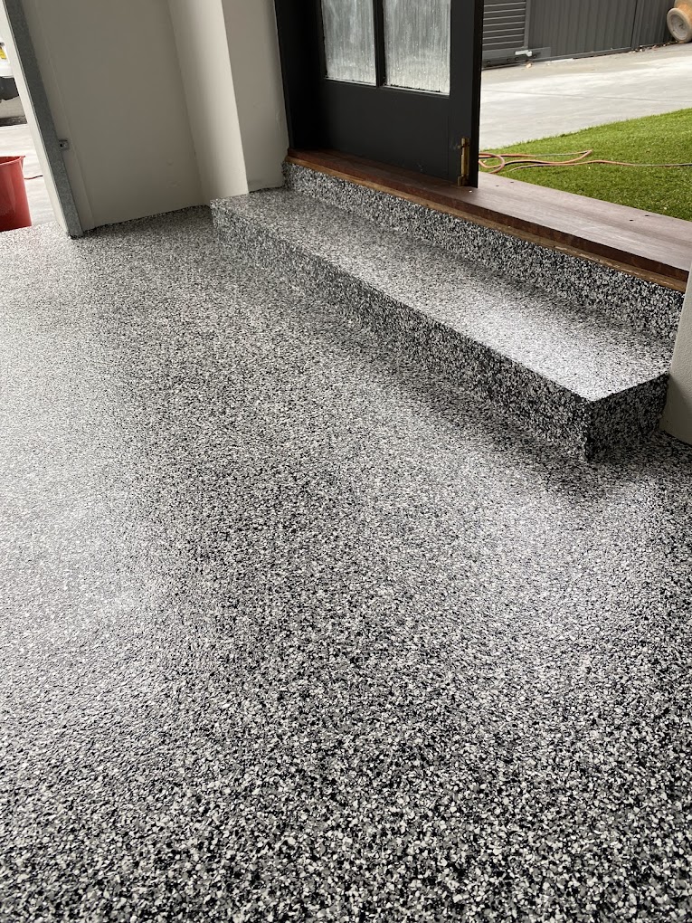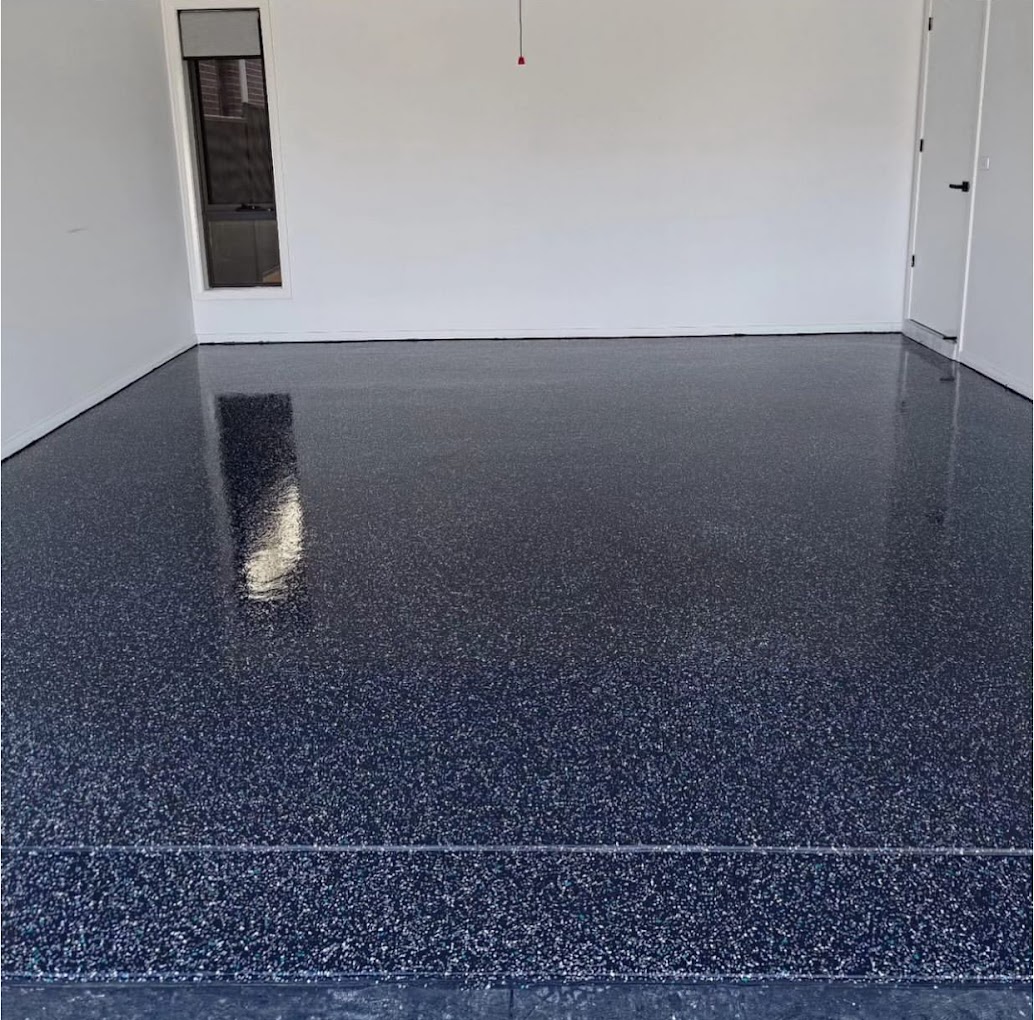 Flake epoxy flooring provides durability and style, featuring a unique speckled texture that enhances any space.